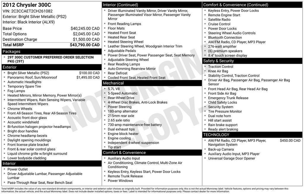 This 2012 Chrysler 300 C is a remarkable blend of style, performance, and luxury. With its impressive list of features and exceptional driving dynamics, it's the perfect choice for those seeking a sophisticated and capable sedan. We invite you to experience the difference for yourself by scheduling a test drive at our showroom. Let us help you discover the true joy of driving.