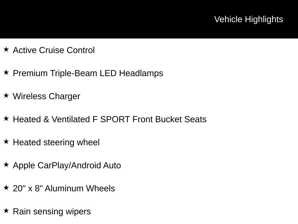 RX 350 F Sport Handling, AWD, Black w/F SPORT NuLuxe Seat Trim, 12.3" Navigation System w/Mark Levinson Audio, 20" x 8" Aluminum Wheels, Active Cruise Control, Adaptive suspension, Apple CarPlay/Android Auto, Cold Area Package, F SPORT Handling Package, Heated & Ventilated F SPORT Front Bucket Seats, Heated steering wheel, Memory seat, Panoramic Moonroof, Power Liftgate, Premium Triple-Beam LED Headlamps, Rain sensing wipers, Touch-Free Power Rear Door w/Kick Sensor, Wireless Charger.