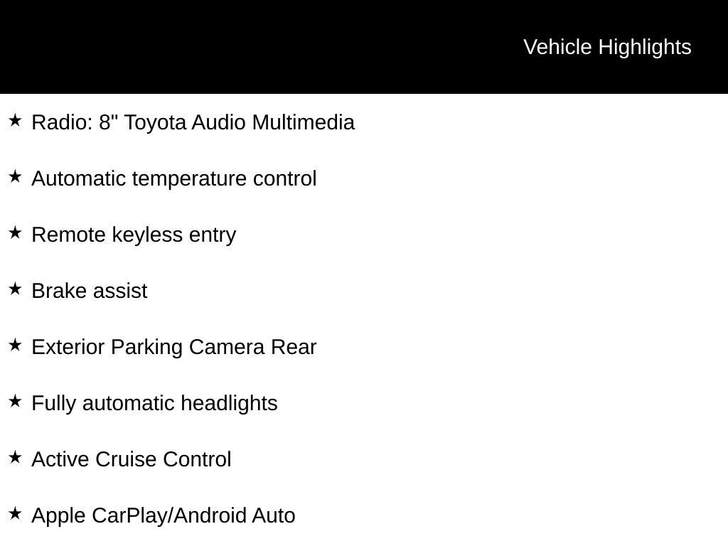 Corolla LE, Active Cruise Control, Apple CarPlay/Android Auto, Automatic temperature control, Brake assist, Exterior Parking Camera Rear, Fully automatic headlights, Radio: 8" Toyota Audio Multimedia, Remote keyless entry.